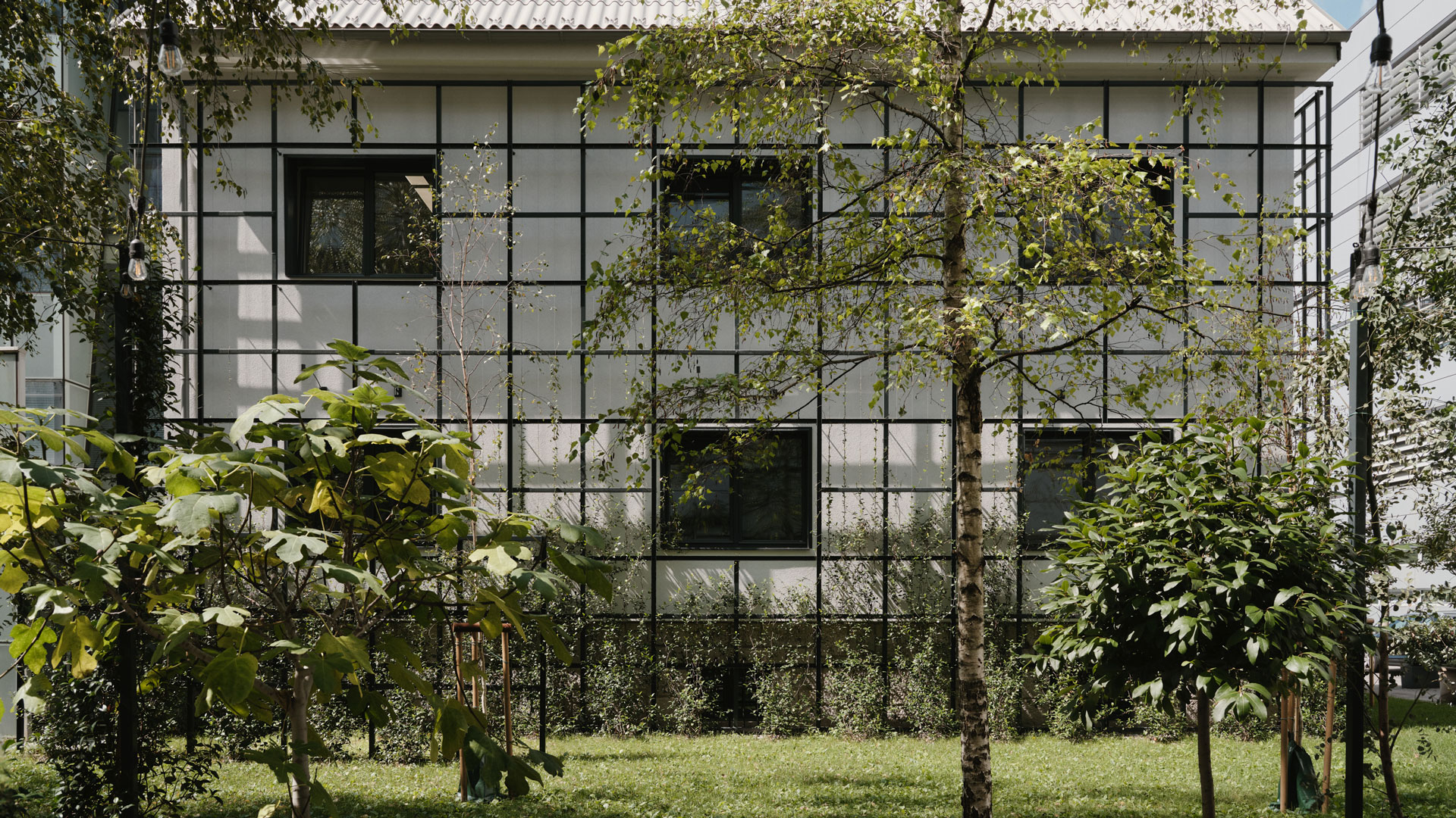 A new façade layer of the grid is introduced, offset from the existing building. As an extension of the park within the business complex, the grid will eventually be overgrown by the plants. The layering creates a three-dimensional effect of relief, play of light and shadow, bringing greenery into the densely built environment.