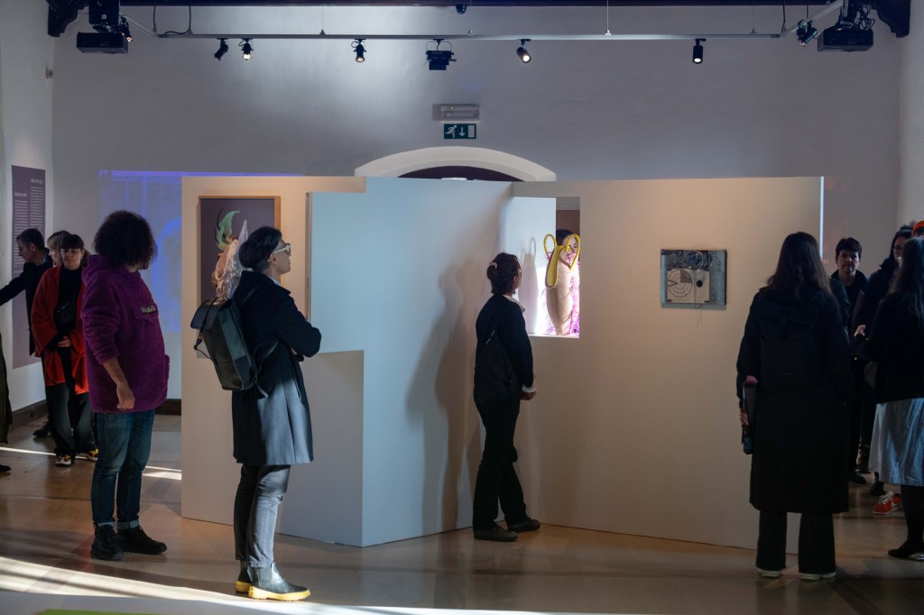 In the historic castle at MAO, horizontal floating plinths provide a minimalist platform for observing artworks from above, while vertical folded walls inspired by origami and floral forms divide larger rooms into smaller, more intimate spaces. This design creates a sense of discovery as visitors navigate the exhibition, encountering unexpected perspectives and compositions.